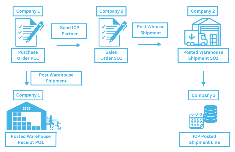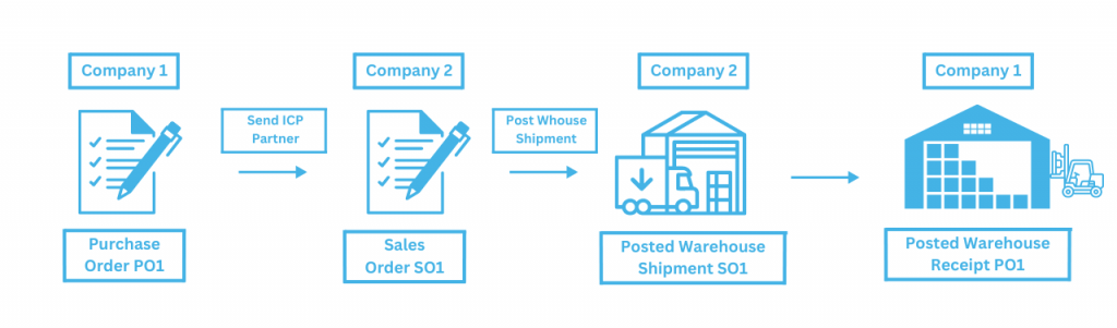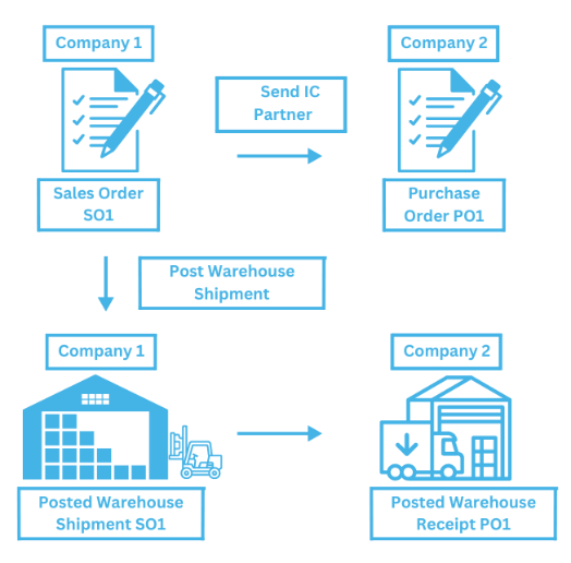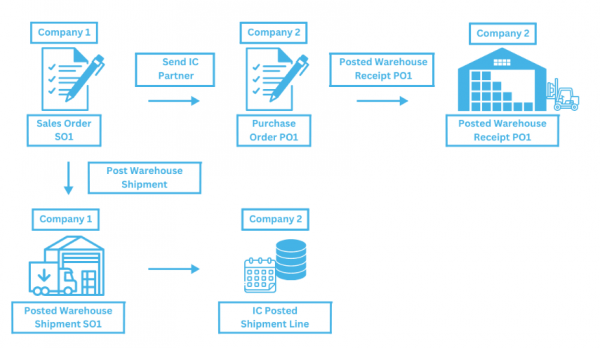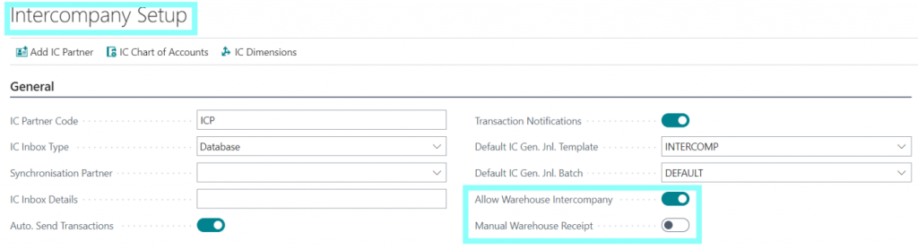 The entire flow is managed through two check boxes, Allow Warehouse Intercompany which must be true if the user wants to use this functionality, and Manual Warehouse Receipt which defines how the warehouse receipt is posted.