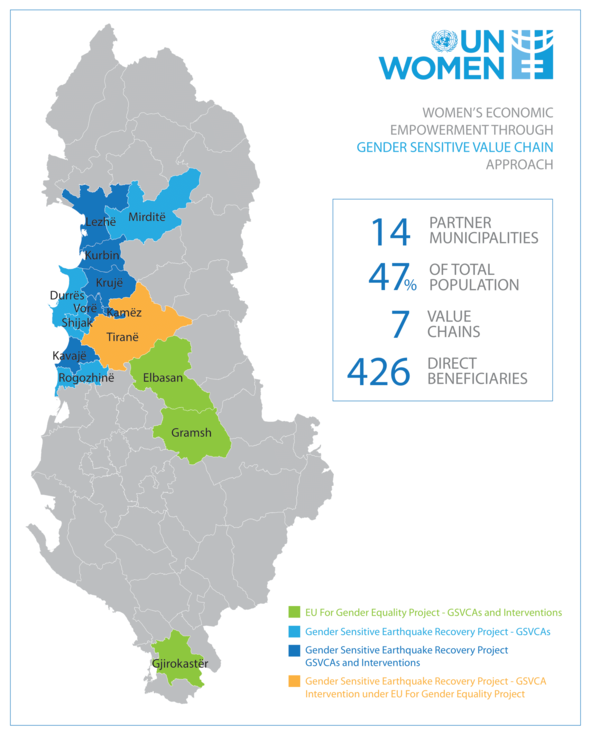 Smart ICT Services conducted 10 Gender Sensitive Value Chain Analysis (GSVCA) in the earthquake-affected municipalities of Shijak, Durrës, Krujë, Tiranë, Kavajë, Vorë, Rrogozhinë, Kurbin, Mirditë and Lezhë. These GSVCAs identify and promote ‘win-win’ scenarios that guarantee market sustainability, and provide development opportunities that address problems in a value chain in conjunction with addressing gender inequalities inherent in and along the chain. These gender-responsive ‘win-win’ scenarios tend to: